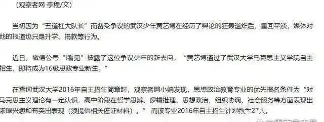 他老是跑去参加一些社会活动,比如说去养老院当志愿者,拍照没少,结果让有些人觉得他就是在演戏。有人在问,这小孩儿真能对这些大人的玩意儿这么上心吗?背后肯定有家长在捣鼓啥好玩意!更夸张的是,大家开始对他的学分产生了疑惑!听说啊,黄艺博在学校的学习成绩实在不咋地,连中考都没能进入水果湖高中,最后还是初中老师拼命推荐才让他破格进的!这消息一出来,大家纷纷开始嗤之以鼻,觉得他那些闪亮的奖状是华丽的外衣罢了。从初中起,黄艺博的学习成绩像坐滑梯一样下滑,压力越大,困难就跟着蹦出来。他爹他妈这会儿可没调整教育的方法,非得把黄艺博捧得跟个明星似的,带他到处跑活动,还让媒体来采访。这一下搞得黄艺博没法把心思全放在学习上,成绩也跟着一路下滑。在华一寄宿学校上学的时候,校长曾说,黄艺博的成绩差不多是在全名附近,就跟个中间水平的豆腐一样。校长希望他别总往外跑和上电视,最好把心思放在书本和日常生活上。可惜的是,这个建议在黄艺博和他家里人的眼里,就像大雾霭中闪烁的星星,根本没被看上。上了高中后,黄艺博还是对“当官”这事儿情有独钟,把大把的时间和心血都扑到学生会里去了。他在学校里当团委的小领导,特别喜欢折腾各种活动,走到哪儿都能瞅见他忙得不可开交。可这小子根本不把学业放在心上,上课的时候老是发愣,课后更是懒得翻书做作业。慢慢的,他的成绩掉得跟跌水似的,到了高考这个紧要关头,他脑袋里装的知识和学习能力都跟不上了,根本没法拿到好分数。2016年高考前,黄艺博在武汉大学的马克思主义学院面试过关,只要到时候高考成绩比湖北的一本线分就能进门!这本来是个金光闪闪的好机会,结果高考分数一公布,小伙子竟然只得分,连一本线都没跨过去,只能去民办院校武汉学院报到。这下子可把大家的眼珠子都瞪出来了,人人都在担心他接下来的日子怎么过!
